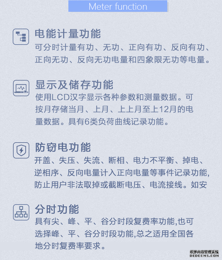主要功能:有功,功率因素,有功功率,無功功能,視在功率,四象限無功,電壓,電流,事件報警,需量